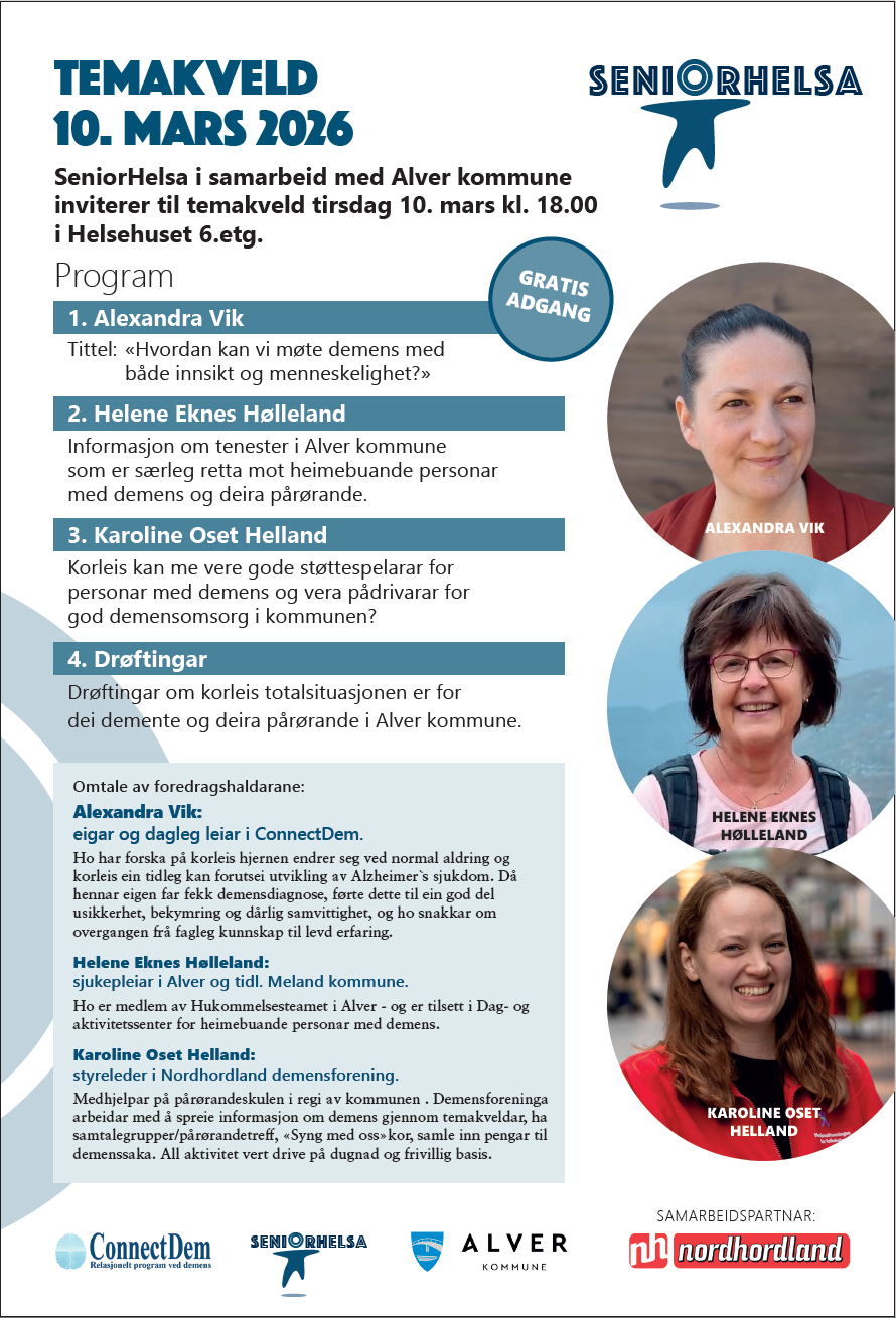 SeniorHelsa i samarbeid med Alver kommune inviterer til temakveld tirsdag 10. mars kl. 18.00 i Helsehuset 6.etg.